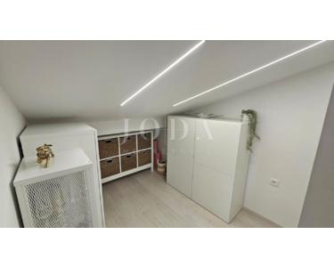 Die Wohnung selbst erstreckt sich über zwei Etagen. In der unteren Etage befinden sich zwei Schlafzimmer, ein Badezimmer und ein sehr großer Raum mit einem offenen Konzept von Wohnzimmer und Küche mit Zugang zu einem großen Balkon. Der unten beschriebene Teil erstreckt sich über 80 m2, während sich im Dachgeschoss ein schönes Schlafzimmer und ein großer Abstellraum befinden, die zusammen eine Fläche von fast 30 m2 ausmachen.
