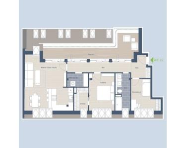 Als Penthouse gestaltet, verteilt sich diese Wohneinheit auf 3 lichtdurchflutete Räume, ein Badezimmer mit Badewanne und Doppelwaschbecken, eine Abstellkammer/Hauswirtschaftsraum sowie eine über 18 m² Terrasse, welche sich über die gesamte Länge der Wohnung erstreckt und diese mit Tageslicht durchflutet.