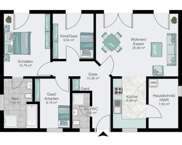 Dieser Bungalow erfüllt den hohen KFW40 Standard und garantiert somit eine nachhaltige und kostensparende Energienutzung. Die schlüsselfertige Ausbaustufe umfasst bereits hochwertige Wand- und Bodenbeläge sowie stilvolle Zimmertüren. Darüber hinaus können Sie aus verschiedenen Dachformen wählen - sei es das elegante Walmdach, das klassische Zeltdach oder das moderne Flachdach im Bauhausstil.