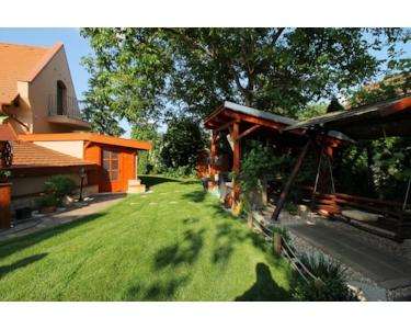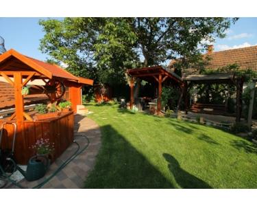 A parkosított udvart egy termetes diófa ékesíti, és több ácsolt faszerkezet emeli még az ingatlan értékét, (fedett autóbeálló, kerti faház, filagória épített grillezővel, kerti fedett hinta stb.).