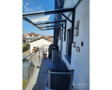- Glasüberdachung auf einem Balkon, Markise auf dem 2. Balkon
