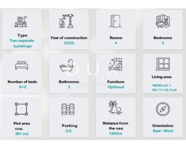 Poreč ist auch eine Stadt, die viel mehr ist als ein Sommerziel mit Sonne und Meer. Poreč ist eine Stadt, die auf die Bedürfnisse der Menschen zugeschnitten ist. Eine Stadt, in der es einen ständigen Impuls gibt, die Lebensbedingungen zu verbessern und den Fortschritt in verschiedenen Bereichen voranzutreiben. Eine Stadt, die ein angenehmer, sicherer und gepflegter Wohnort ist, in dem jeder seinen Platz findet, eine Stadt ohne Abgaben mit hoher sozialer Sensibilität für alle Generationen. Zum Verkauf steht ein modernes Haus mit luxuriösem Design, nur 1,8 km vom Meer und Poreč entfernt. Dieses elegante zweistöckige Gebäude besteht aus zwei Wohneinheiten bzw. zwei Doppelhaushälften mit jeweils 169 m² Wohnfläche. Im Erdgeschoss jedes Hauses gibt es einen großzügigen offenen Raum, der die Küche und das Esszimmer, ein Wohnzimmer mit Zugang zum Garten, ein Badezimmer und einen Abstellraum beherbergt. Große Glaswände bringen viel natürliches Licht und Wärme in die Häuser. Über eine Innentreppe gelangt man in den ersten Stock jedes Hauses, wo sich drei komfortable Schlafzimmer befinden. Das Hauptschlafzimmer verfügt über ein eigenes Badezimmer, während sich die beiden anderen Zimmer ein zweites Badezimmer teilen. Einen besonderen Eindruck der Häuser hinterlassen die großzügigen Dachterrassen mit jeweils 66,71 m2 und Whirlpool, Sommerküche und Esstisch, die ideal sind, um die Sonnenuntergänge und absolute Privatsphäre zu genießen. Die Häuser sind von einem 760 m² großen Garten umgeben, der über eigene private Swimmingpools als Orte zum Entspannen und Genießen in einer ruhigen Umgebung sowie Grillplätze für Mahlzeiten im Freien verfügt. Die Gärten und die Pools sind räumlich voneinander getrennt, sodass jedes Haus im Freien ausreichend Privatsphäre hat. Pro Haus stehen zwei PKW-Stellplätze zur Verfügung. Der Preis bezieht sich auf eine schlüsselfertige Anlage. Die Lage ist ruhig und dennoch nah am Meer und allen Annehmlichkeiten, was das Haus zu einer hervorragenden Gelegenheit sowohl für die private Nutzung als auch für eine touristische Investition macht. Es besteht die Möglichkeit, nur ein Haus zu kaufen. Für weitere Informationen und zur Vereinbarung eines Besichtigungstermins kontaktieren Sie uns bitte.