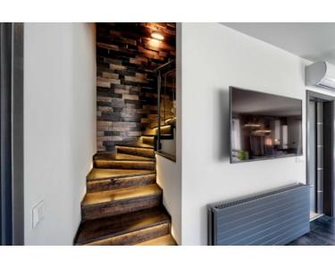 A nagyméretű ablakoknak köszönhetően rendkívül világos a ház, az ablakok mindegyikén elektromos alumínium REDŐNY található. Fűtéskiegészítésként a padlófűtés mellett látványos KANDALLÓ található a nappaliban, a tetőn pedig 8 kw NAPELEM segíti a ház ENERGIATAKARÉKOS ellátását.