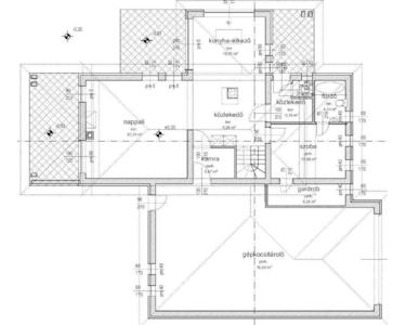 A földszint meghatározó, központi része, az egylégterű, D-i tájolású, nagy üvegfelületekkel rendelkező, több irányból fedett terasszal rendelkező, NAPPALI-ÉTKEZŐ-KONYHA.