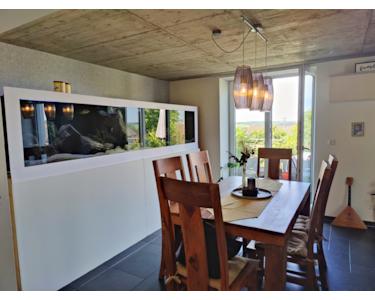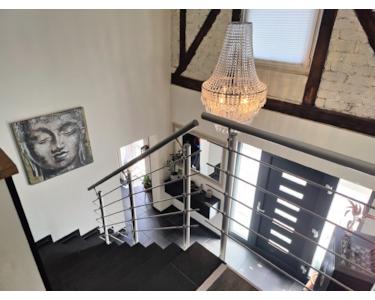 Die Doppelhaushälfte verfügt über ca. 188 m² Wohnfläche. Das Erdgeschoss ist offen gestaltet und bietet teilweise unverputzte Betondecken im Industrial Style. Auch der Rest des Hauses wurde geschmackvoll und modern hergerichtet. Vom Wohn- bzw. Esszimmer gelangt man auf eine riesige Außenterrasse und in den liebevoll angelegten Garten mit Gartenteich. Die Diele bietet einen freien Blick in die Galerie im OG. Beim Umbau wurde auf eine energieeffiziente Gestaltung geachtet. So wurden z.B. die Außenwände im EG mit einer zweiten Mauer und im EG und OG mit einer zusätzlichen Außendämmung versehen. Im Dach wurde der Dachboden gedämmt.