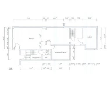 Ein ansprechender Büroraum sowie ein WC, welches über wenige Treppenstufen erreichbar ist, schließen sich direkt an den Verkaufsraum an. Im hinteren Bereich befindet sich ein Lagerraum, der als Durchgang zum Aufenthaltsraum mit anschließendem Laborraum dient.
