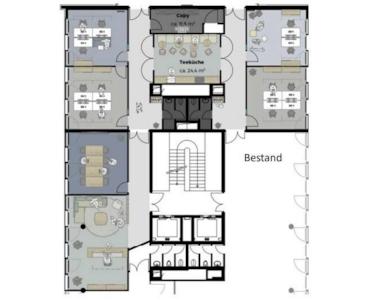 - Abgehängte Decken mit bildschirmarbeitsplatzgerechter Beleuchtung: Gewährleisten eine angenehme Arbeitsatmosphäre.