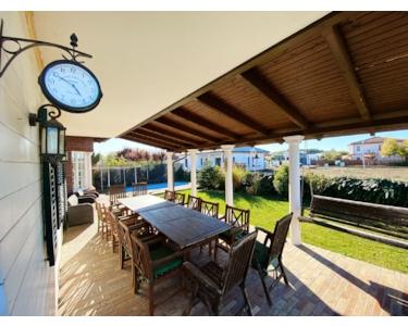 57 m² große untere Terrasse mit Blick auf den Pool.