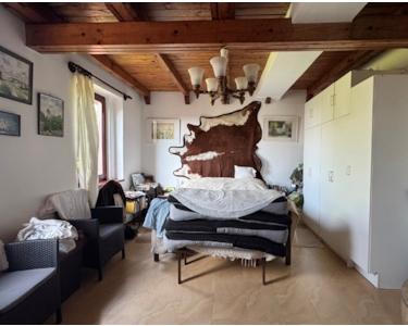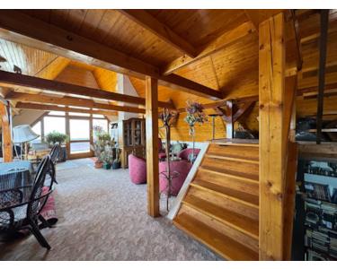 Alle Teile des Dachgeschosses sind eingebaut, galerieartig und getäfelt. Auf dieser Ebene befinden sich ein Badezimmer, ein Schlafzimmer und ein großes Wohnzimmer. Vom Wohnzimmer aus gelangt man außerdem auf einen 17 m² großen Balkon.