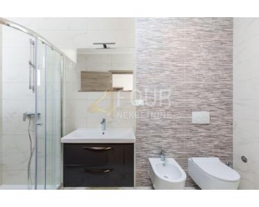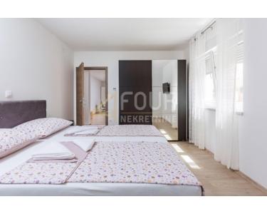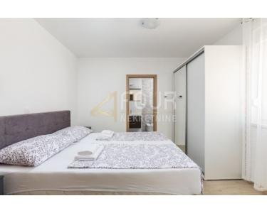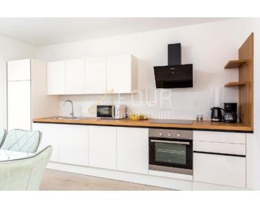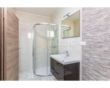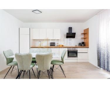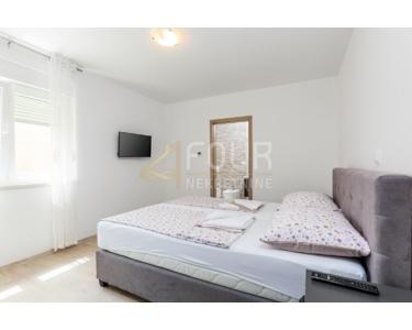 Zum Verkauf steht eine moderne Wohnung in Medulin, in außergewöhnlicher Lage nur 60 Meter vom Meer und der Hauptpromenade entfernt. Die Wohnung befindet sich im ersten Stock eines kleineren Gebäudes und bietet mit 90,33 m² eine komfortable und funktionale Raumaufteilung – ideal zum Wohnen oder für den Urlaub. Sie besteht aus einem Flur, einem Wohnzimmer mit offener Küche, zwei Schlafzimmern mit jeweils eigenem Bad, einem zusätzlichen Gäste-WC und einem Waschraum. Außerdem verfügt die Wohnung über einen Balkon, einen Abstellraum unter der Treppe sowie zwei Parkplätze, von denen einer überdacht ist.