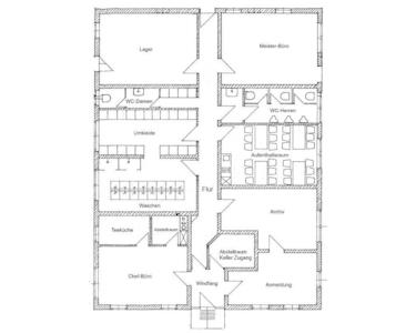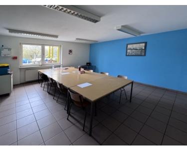 Das Erdgeschoss des Anbaus wird als Büro- und Sozialfläche genutzt. Das gesamte Erdgeschoss ist gefliest, über einen Außenzugang erreichbar und wird mit einer Ölzentralheizung beheizt. Über den Flur sind nahezu alle Räume sowie die Halle begehbar. Vom Chefbüro aus ist eine Teeküche sowie ein Abstellraum erreichbar. Im Aufenthaltsraum ist eine zusätzliche Küchenzeile vorhanden. Aufgrund der Vielzahl von Fenstern ist die Fläche sehr hell und freundlich. Deckenleuchten sorgen für ausreichend Licht. Eine EDV-Verkabelung ist vorhanden. Die WCs sind deckenhoch hell gefliest.