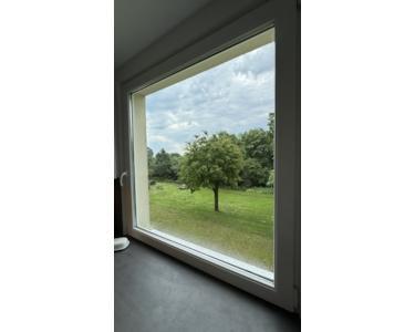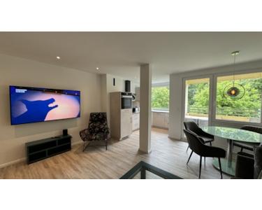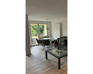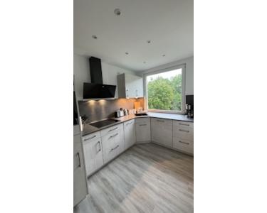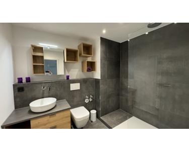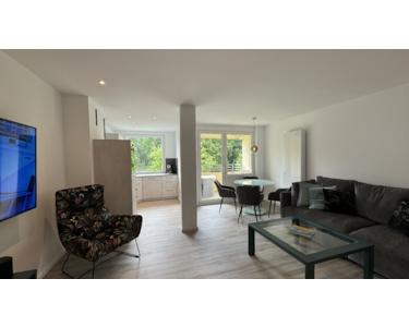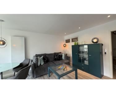 Sie betreten das Objekt über einen gepflegten Hausflur mit Fahrstuhl. Die Wohnung befindet sich im 1. OG. Über einen großzügigen Flur mit Garderobe, Schuhschrank und Spiegel gelangen Sie rechter Hand in das Schlafzimmer. Ein 1,80m großes Boxspringbett, 2 Nachtkonsolen und ein großer Schiebeschrank - alles in weiß mit beige sehr hell gestaltet - erwarten Sie. Linker Hand befindet sich das Badezimmer mit Aufsatzwaschbecken, Regal, Spiegelschrank, Hänge-WC und extra großer Glasdusche und Handtuchwärmer in trendigem anthrazit mit weiß. Vom Flur aus geradeaus befindet sich das helle Wohn-Esszimmer mit offener Designerküche, die neben einer Kühl-Gefrierkombi, Ceran-Kochfeld mit Dunstabzugshaube und einem Backofen in praktischer Augenhöhe sowohl eine Spülmaschine als auch einen Waschtrockner bietet. Elektrogeräte (Toaster, Kaffeemaschine, Wasserkocher etc.), Geschirr und Gläser, Topf- und Pfannenset und viele andere Küchenutensilien sind alle von namhaften Herstellern (u.a. WMF, Siemens, Schott etc.) und wie die gesamte Einrichtung neu. Die Farben grau, weiß und türkis geben eine wohnliche Atmosphäre. Vor dem Essbereich befindet sich ein schöner Balkon mit Blick ins Grüne. Hier laden moderne Geflechtmöbel (2 Sessel & Tisch) zum Sun-Downer oder Sommerfrühstück ein.
