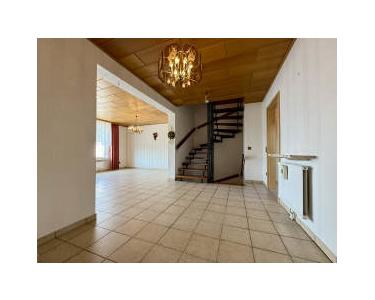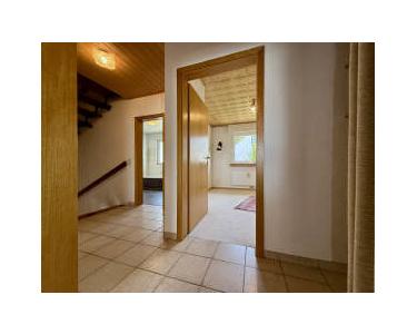 Der Keller sowie das Erdgeschoss sind komplett gefliest. Im Obergeschoss sind der Flur und das Bad gefliest, in den drei Schlafräumen ist derzeit Teppich verlegt (darunter liegt Estrich).