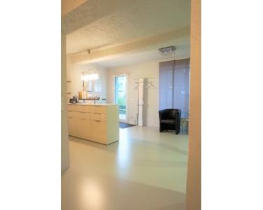 - hellgrauer Kunstharzboden im vorderen Eingang und Arbeitsbereich