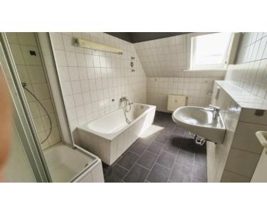 - Tageslichtbad mit Badewanne u. Dusche komplett gefliest, WA- Anschluss, WC