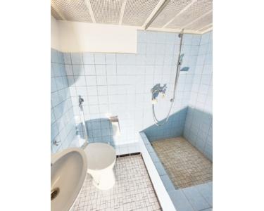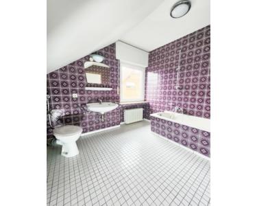 Das Badezimmer im Design aus den 70er Jahren bietet Platz für mehrere Personen. Von der Größe her dürfte eine Neugestaltung mit begehbarer Dusche etc. nach den eigenen Wünschen möglich sein.