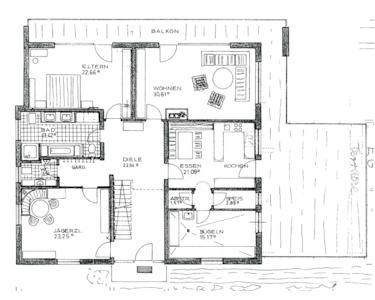 EG: Diele, Wohnzimmer mit Ausgang zum Balkon und großer Terrasse, Wohnküche, Abstellraum, Speis, Hauswirtschaftsraum, Schlafzimmer, Bad, Gäste-WC, Kinderzimmer (steht leer)