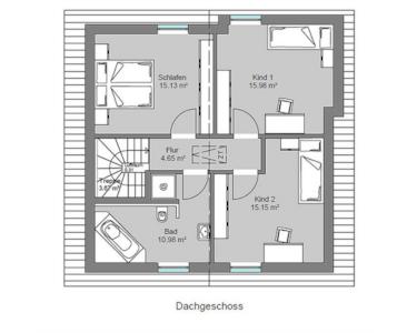 Darf es etwas mehr sein? Den beliebten Hausentwurf mit Satteldach gibt es jetzt auch mit 128 m² Wohnfläche. Das bedeutet: Jeder Raum ist großzügiger. Unten das Familien-Kommunikationszentrum mit offener Küche und angrenzendem Hauswirtschaftsraum. Oben Schlafzimmer, Bad und zwei Kinderzimmer. Die Flure nehmen den Räumen auch bei diesem Entwurf keinen Platz weg.