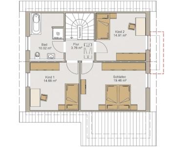 Sinnvoll: Ein zusätzliches Arbeits-/ oder Gästezimmer schafft Planungsfreiheit im Erdgeschoss. Oben gefällt das große Schlafzimmer und zwei mit jeweils ca. 15 m² gleich groß entworfene Kinderzimmer. Da gibt es keinen Streit um das größere Zimmer. Komplettiert wird das Obergeschoss vom richtig dimensionierten Familienbad. Ein Haus für die ganze Familie eben.