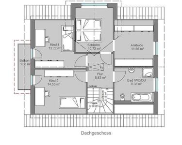 Im Dachgeschoss haben wir den Flur bewusst kleiner geplant und so mehr Platz für das Schlafzimmer mit eigenem Ankleideraum und die 2 großzügigen Kinderzimmer mit Balkon geschaffen.