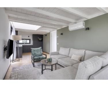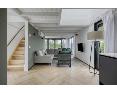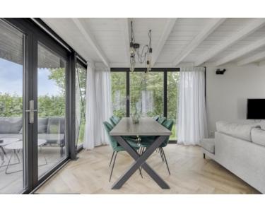 Das helle und geräumige Wohnzimmer ist das Herz des Hauses und bietet dank seiner Lage am Rande des Parks eine Oase der Ruhe. Große Fenster, ein Oberlicht und Flügeltüren sorgen für viel natürliches Licht und eine nahtlose Verbindung nach draußen. Die moderne, offene Küche schließt perfekt an das Wohnzimmer an und macht den Raum einladend und praktisch zugleich. Der PVC-Bodenbelag im Fischgrätmuster verleiht ein luxuriöses und warmes Gefühl, während die offene Raumaufteilung ein Gefühl von Raum und Freiheit vermittelt.