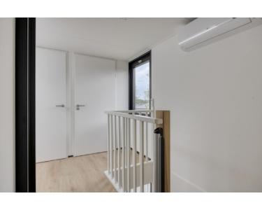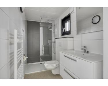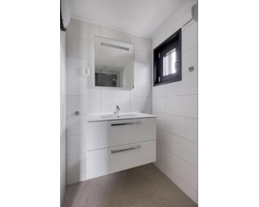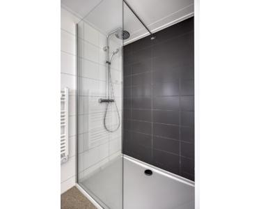 Das Badezimmer im Obergeschoss ist modern und stilvoll eingerichtet und mit einer geräumigen, begehbaren Dusche für optimalen Komfort ausgestattet. Darüber hinaus verfügt das Badezimmer über eine hängende Toilette, ein Waschbecken mit Unterschrank und einen Design-Heizkörper, die für einen luxuriösen und praktischen Look sorgen. Ein schöner Raum, um den Tag erfrischend zu beginnen oder entspannt ausklingen zu lassen.