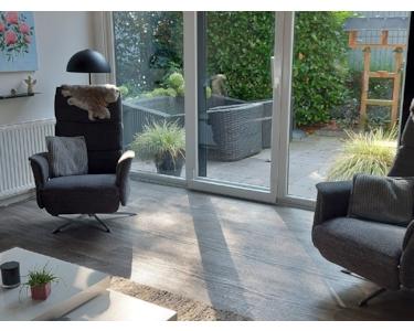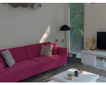 Das Wohnzimmer selbst verfügt über ein buntes S-Zitzer-Sofa und 2 neue Relaxsitze. Ein Fernseher mit CAI-Anschulss, ein TV Schrank mit Couchtisch und 2 gemütliche Stehlampen.Vom Wohnzimmer aus haben Sie einen Blick auf den Garten und alles was darin lebt, vögel, Eichhörnchen...Die Fenster im Wohnzimmr sind joch, was viel Licht gibt. Das grosse Fenstr hat ein Schiebefenster mit einer einziehbaren Fliegengittertür und ist mit schwarzen Lamellen ausgestattet. Die andere Fenster haben alle aluminiumlamellen. Der wohnbereich liegt nach hinten, ruhe und privacy. Es gibt Airco für den gesamten Wohnbereich und im Winter können sie von Hause aus die Temperatur regeln.