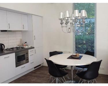 Ausgestattete küche mit Gasherd, Dunstabzugschaus, Kuhlschrank, Gefrierschrank, Kombi-Mikrowelle, Senseo, Wasserkocher, Gemütlicher Esstisch mit 4 Stühlen.