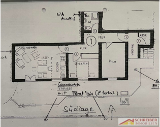 Die Erdgeschosswohnung (Hanglage) ist über eine Treppe erreichbar. Über den separaten Eingang gelangt man in einen geräumigen Flur. Von hier aus gehen das Schlafzimmer, das Kinderzimmer, das Wohnzimmer mit Küchenzeile und das Bad mit Dusche ab. Vom Wohnzimmer aus gelangt man auf eine Terrasse auf der Sie den ganzen Tag die Sonne genießen können. Ein Carport und ein Abstellraum ergänzen das Angebot.