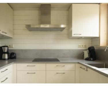 Royale keuken voorzien van inductie kookplaat, afzuigkap, combi oven magnetron, koelkast met vriesvak en een vaatwasser.