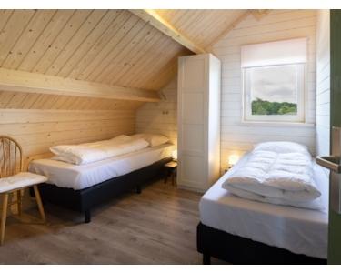 Royale slaapkamer met twee 1 persoons box spring bedden, voorzien van kast met spiegel en stoel.