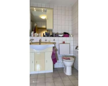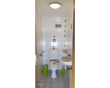 Das Badezimmer ist funktional ausgestattet und verfügt über eine Badewanne mit Duschfunktion, ein Waschmaschinenplatz sowie Waschbecken und Toilette. Zusätzlich gibt es ein praktisches Gäste-WC mit einer weiteren Toilette und Waschbecken.