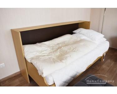 1. Wohn/Schlafzimmer mit Schlafsofa 160x200 cm, Couchtisch, Schreibtisch mit Stuhl, Schrankwand mit Kabel-TV, Schrankbett 90x200 cm, Laminat, Zugang zum