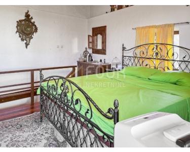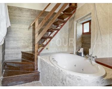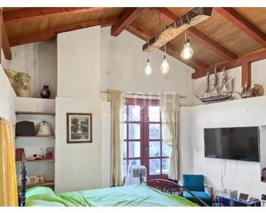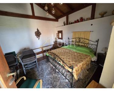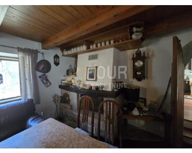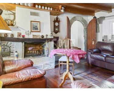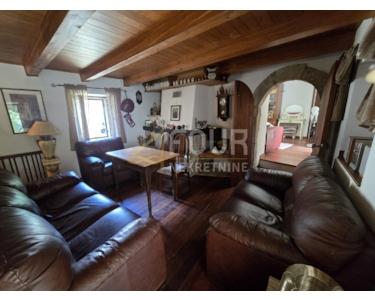 Ein Kamin sorgt für zusätzliche Wärme und Gemütlichkeit, während die Holzfenster den rustikalen und authentischen Charme des Hauses unterstreichen.