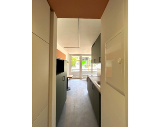Spülmaschine, 2-Platten Ceranherd, Spüle, Kühlschrank, Abfallbehälter, Besteckschublade, Schränke, Regale, Verdunklungsvorhang