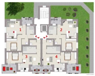Im Erdgeschoss befinden sich vier 2-Zimmer Wohnungen mit Wohnflächen zwischen ca. 52 m² und ca. 58 m².