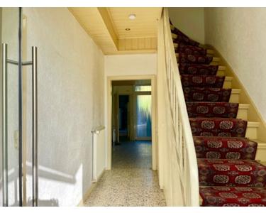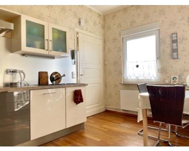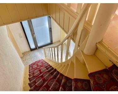 Von der Straße gelangt man über mehrere Stufen zum Hauseingang und betritt das originalgetreu erhaltene Treppenhaus. Von hier aus gelangt man in die ca. 80 m² große, renovierungsbedürftige Erdgeschosswohnung. Diese verfügt über eine Küche, ein Wohnzimmer und zwei Schlafzimmer. Die Räume sind wie auch das kleine Badezimmer durch einen Flur erschlossen. Im hinteren Teil dieser Etage befinden sich Heizungsraum und Werkstatt. Das Obergeschoss wurde 2013 neu renoviert und zu einer Wohnung mit ca. 96 m² und offenem Raumkonzept umgestaltet. Im Dachgeschoss befinden sich drei Mansardenzimmern und ein kleines Bad sowie Speicherplatz.