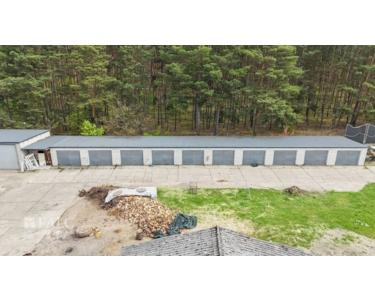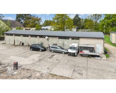 Die Außenanlage umfasst mehrere Garagen und unterschiedlich große Lagerflächen und Hallen, die zusätzlichen Stau- und Arbeitsraum bieten. Die Garagen sind robust gebaut und bieten Schutz für Fahrzeuge oder zusätzliche Materialien.