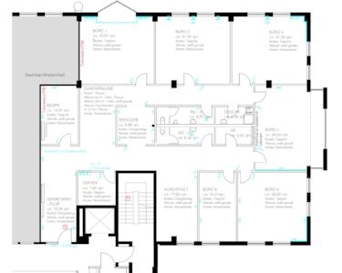 Diese rund. 352 m² große und in 2022 neu sanierte Bürofläche im 1. OG ist über einen Aufzug und über ein großzügiges Treppenhaus erreichbar. Sie ist unterteilt in sechs Büros, Sekretariat, Besprechungsraum, Aufenthaltsraum, Server-Raum, Arbeitsraum, Teeküche, zwei WCs sowie einer separaten Dusche. Zudem verfügt die Einheit über modernste EDV-Verkabelung.
