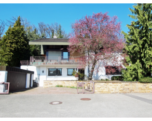 Der terrassenförmig angelegte Garten mit schönem Baumbestand bietet eine natürliche Atmosphäre und viel Raum zur Entspannung. Eine Doppelgarage sorgt für ausreichend Parkmöglichkeiten.