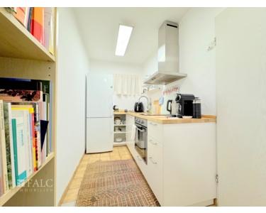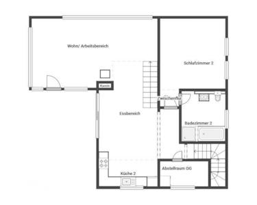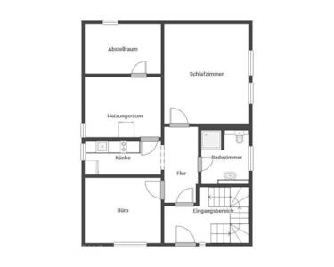 Die Einliegerwohnung empfängt Sie mit einem großzügigen Flur, von dem aus Sie zur linken Seite in ein Büro sowie in die offene Küche gelangen. Rechts befindet sich das Badezimmer, und geradeaus schließt sich das Schlafzimmer an. Ein direkter Zugang von der Küche führt in die angrenzenden Heiz- und Lagerräume.
