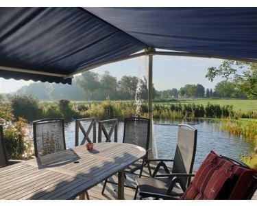 große Teakholz-Terrasse am Teich mit frei stehender Markise