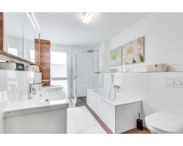 Das stilvolle Badezimmer überzeugt mit einer bodengleichen Regendusche, einer Badewanne und einem großzügigen, bodentiefen Fenster, das für angenehmes Tageslicht sorgt. Zusätzlich steht eine praktische Speisekammer zur Verfügung, die bereits über alle Anschlüsse für den Ausbau eines separaten Gäste-WCs verfügt.