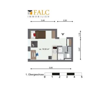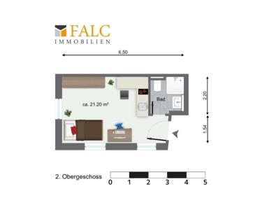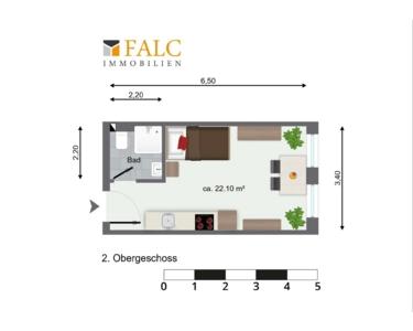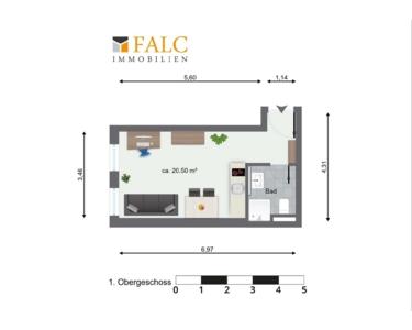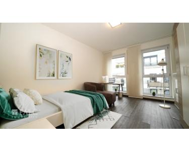 Das offene Wohn- und Schlafzimmer ist ideal für eine individuelle Gestaltung und lädt zum Entspannen ein. In der kleinen, aber funktionalen Küche finden Ihre Mieter alles, was sie für ein entspanntes Kochen brauchen: Stauraum, Kochstelle, Mikrowelle mit Backofenfunktion und eine Ablufthaube. Das Duschbad ist modern und zeitlos in Weiß gehalten.