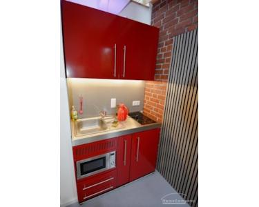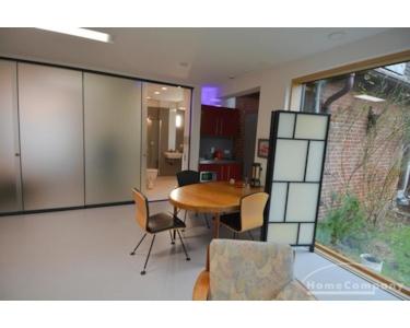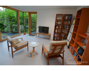 Ebenerdig betreten Sie das helle Appartement, das sich durch dicke, blickdichte Schiebewände wahlweise in einen großen, weiten Raum, oder in ein kleines Schlafzimmer (nur Sichtschutzrollos) und in einen mit nach zwei Seiten mit Terassen- und Fensterschiebewänden versehenen, offenen Wohn-/ Essraum mit Pantryküche verwandeln lässt.