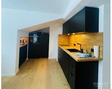 Die Dachgeschosswohnung verfügt über zwei Schlafzimmer, zwei Bäder, einen ca. 40 qm großen Wohnraum mit moderner, offener Einbauküche, einem kleinen Balkon und jeder Menge Stauraum unter dem Dach.