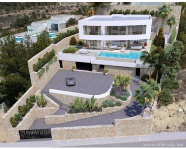 Luxuriöse Villa mit Meerblick in Calpe - Moderne Eleganz mit atemberaubender Aussicht~~Erstklassige Lage in Calpe, Alicante - ruhige und etablierte Gegend~~Diese luxuriöse Villa befindet sich in Calpe, Alicante, eingebettet in einer ruhigen und etablierten Gegend, die für ihren Charme und die Nähe zu einigen der besten Attraktionen der Gegend bekannt ist. Nur 5,4 km vom Zentrum von Calpe entfernt, bietet diese Villa bequemen Zugang zum Stadtzentrum und zu den atemberaubenden Stränden von Calpe, die sich durch kristallklares Wasser und weichen Sand auszeichnen. Calpe ist bekannt für seine landschaftliche Schönheit und ist umgeben von Naturparks und dem berühmten Peñón de Ifach, einem Wahrzeichen, das der Landschaft einen einzigartigen Charakter verleiht.~~Interessante Punkte in der Nähe:~~Calpe Zentrum und Strände: Nur 5,4 km entfernt, mit leichtem Zugang zu den örtlichen Geschäften, Restaurants und Stränden.~Flughafen Alicante: 78 km, ideal für internationale und nationale Reisen.~Golfplätze: Mehrere renommierte Golfplätze befinden sich in einem Umkreis von 15 km, ideal für Golfliebhaber.~Einkaufszentren: Das beliebte La Marina Shopping Center in Benidorm ist ca. 25 km entfernt und bietet eine Vielzahl von Einkaufsmöglichkeiten und Restaurants.~Hafen von Calpe: Ca. 6 km entfernt, ideal für Yachtliebhaber und Wassersportler.~~Atemberaubende Villa mit Meerblick und modernem Komfort auf 3 Etagen~~Diese Villa bietet 335 m2 luxuriöse Wohnfläche auf einem großzügigen 1.042 m2 großen Grundstück, mit spektakulärem Blick auf das Meer, den Peñón de Ifach und die Stadt Calpe. Mit drei durchdacht gestalteten Etagen, die durch eine Innentreppe und einen Aufzug miteinander verbunden sind, bietet diese Villa Stil und Komfort auf jeder Ebene.~~Halb-Untergeschoss: Parkplatz, Waschküche und Weinkeller~~Wenn man von der Straße durch ein automatisches Tor einfährt, gelangt man direkt zur Einfahrt in die Garage, die sich auf der Halbkellerebene befindet. Die geräumige 52 m2 große Garage bietet Platz für mehrere Fahrzeuge und verfügt über einen eigenen Waschraum und einen Weinkeller, der einen Hauch von Luxus und Zweckmäßigkeit vermittelt.~~Hauptgeschoss: Offener Wohnbereich und Zugang zum Pool~~Im Hauptgeschoss, das Sie über eine Treppe oder einen Aufzug erreichen, finden Sie einen großzügigen Wohn- und Essbereich, der zu einer 25 m2 großen Veranda und einer beeindruckenden 78 m2 großen Poolterrasse führt. Die offene Küche, die komplett mit Siemens-Geräten ausgestattet ist, geht nahtlos in den Wohnbereich über. Auf dieser Etage befinden sich auch zwei Schlafzimmer mit eigenem Bad und ein Gäste-WC.~~Obere Etage: Private Schlafzimmer mit herrlichen Terrassen~~Im Obergeschoss befinden sich zwei weitere Doppelschlafzimmer, jeweils mit eigenem Bad und Zugang zu offenen Terrassen mit Panoramablick.~~Hochwertige Oberflächen und moderne Annehmlichkeiten~~Die Villa verfügt über eine erstklassige Ausstattung, darunter Technal-Tischlerei mit Sicherheitsglas, LED-Beleuchtung, Fußbodenheizung, Klimaanlage und ein aerothermisches System für Warmwasser und Heizung. Weitere Annehmlichkeiten sind elektrische Jalousien, Einbauschränke, Alarmanlagen für innen und außen, vorinstallierte Sicherheitskameras und ein 10 x 3,3 m großer Infinity-Pool mit Grillplatz. Die Villa ist nach Süden ausgerichtet, um eine optimale Sonneneinstrahlung zu gewährleisten, und verfügt über eine Energieeffizienzklasse A.~~Erleben Sie ein luxuriöses und ruhiges Leben in Calpe
