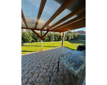 A házhoz tartozik egy nagy fedett terasz, amely a nappaliból nyílik.