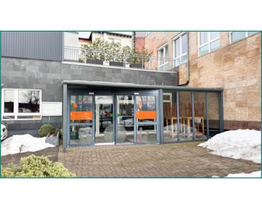Vor dem Eingangsbereich befindet sich eine große Terrasse für Außengastronomie sowie zahlreiche öffentliche Pkw-Stellplätze. Auf verschiedenen Parkebenen.