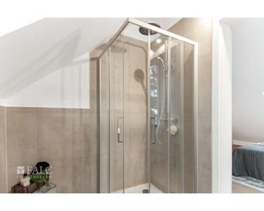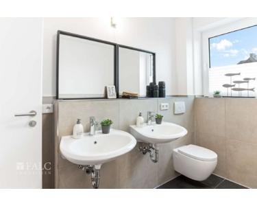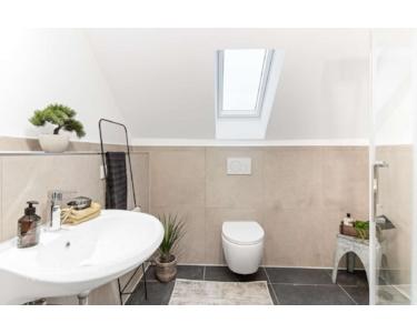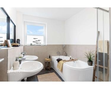 Insgesamt verfügt das Haus über zwei moderne Badezimmer, die mit Duschen samt Rainshower, hochwertigen Markenarmaturen, eleganter Badewanne und großformatigen Fliesen überzeugen. Handtuchheizkörper sorgen zusätzlich für ein angenehmes Wohlfühlklima.